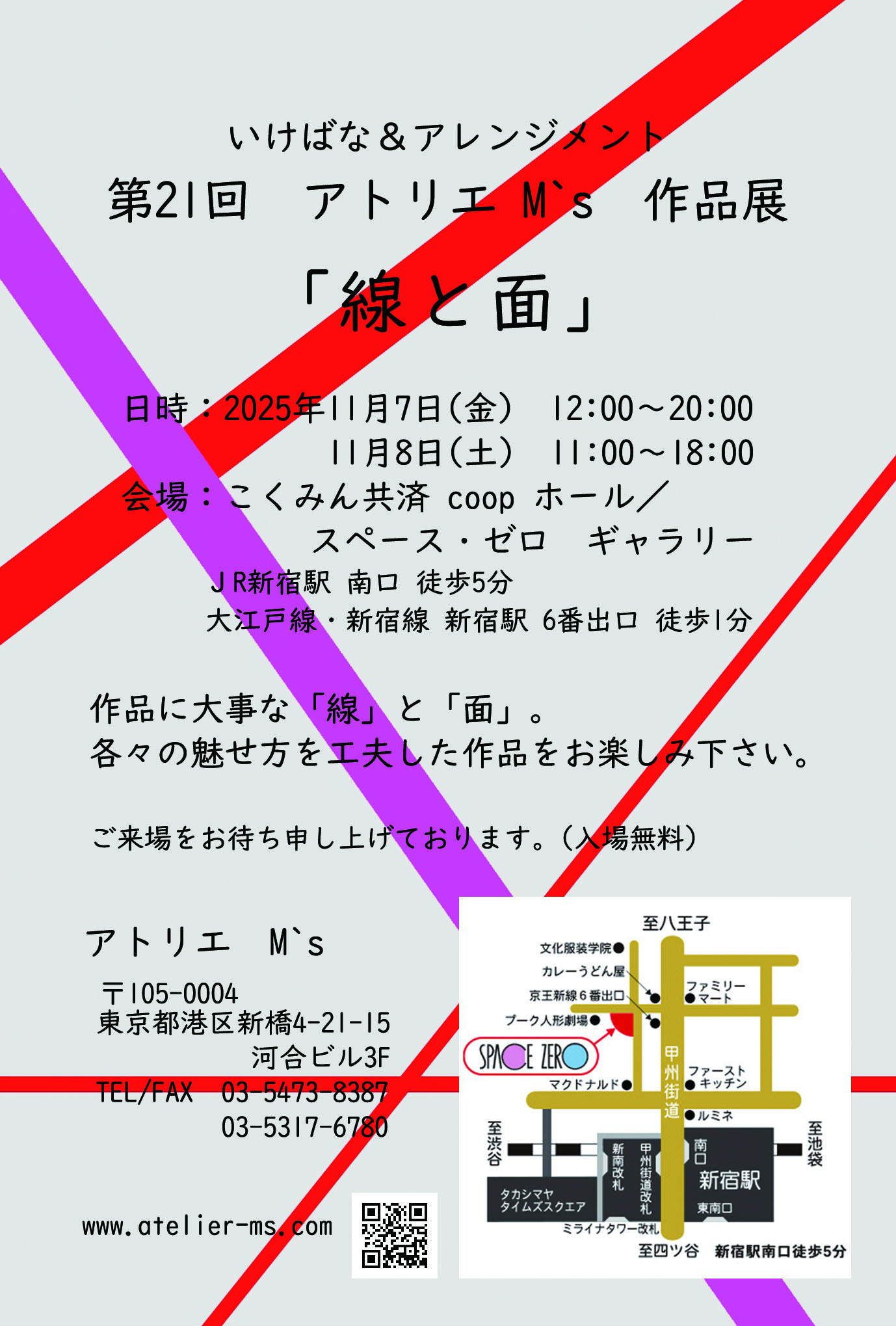 来月11月7日(金)・11月8日(土)に新宿にある『こくみん共済 coop ホール/スペース・ゼロ ギャラリー 』にて第21回アトリエエムズ作品展『線と面』を開催いたします。